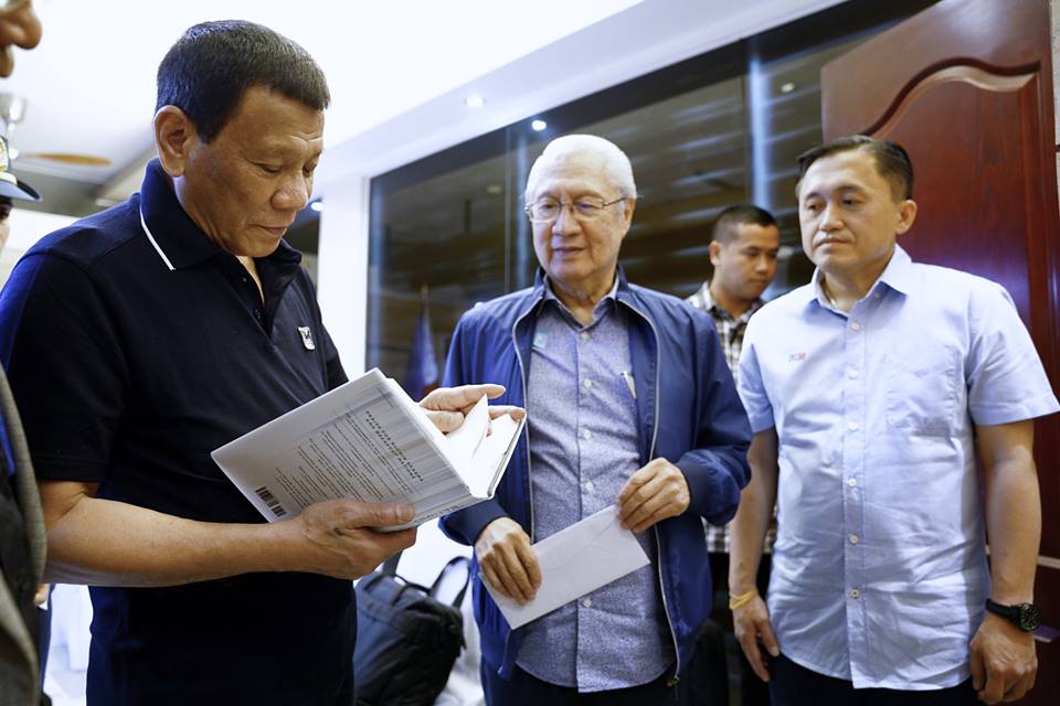 President Rody Duterte receives the book 'The Rise and Fall of Nations: Forces of Change in the Post-Crisis World' by author Ruchir Sharma from Special Envoy for International Public Relations Dante Ang during a meeting at Matina Enclaves in Davao City on August 22, 2018.