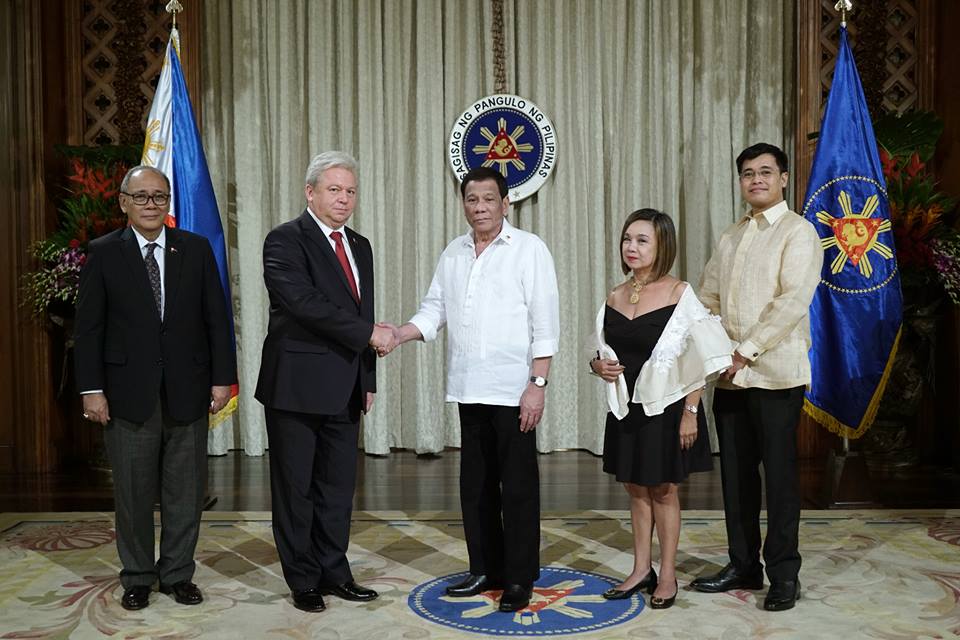 President Rodrigo Roa Duterte poses for a photo with Ambassador-Designate of the Republic of Belarus to the Philippines Valery Kolesnik after receiving the latter's credentials at the Malacañan Palace on September 25, 2018.
