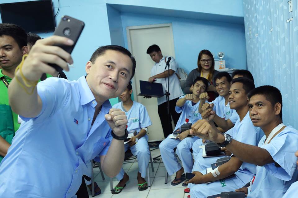 Secretary Christopher Lawrence 'Bong' Go of the Office of the Special Assistant to the President takes a selfie with the wounded soldiers at the Camp Evangelista Station Hospital in Cagayan de Oro City on September 21, 2018.