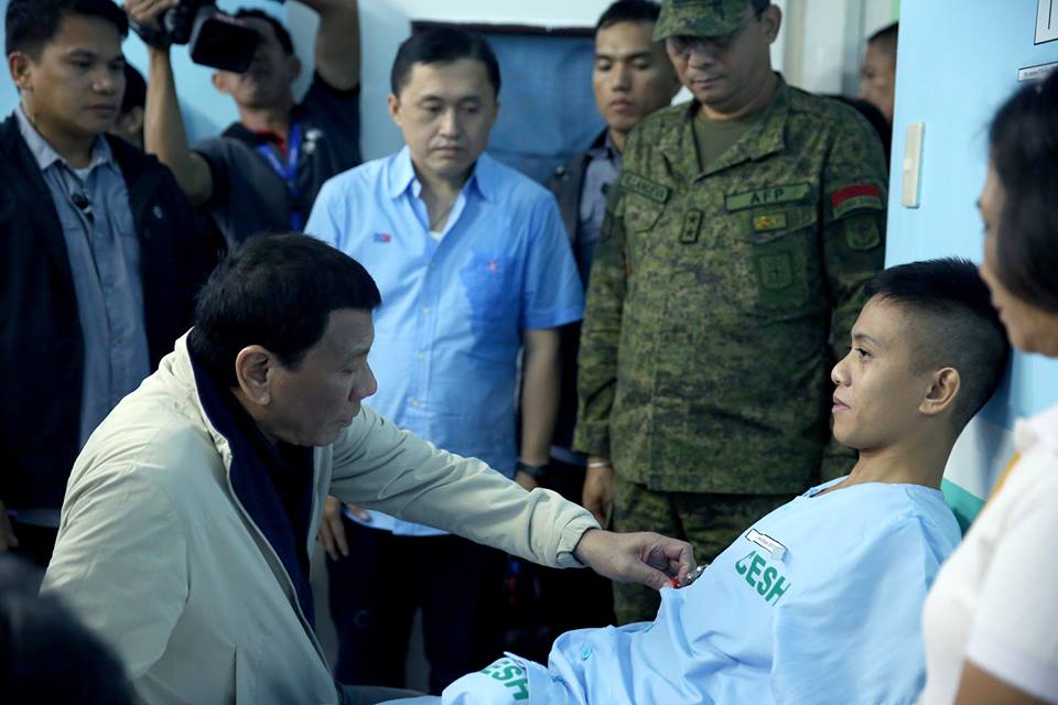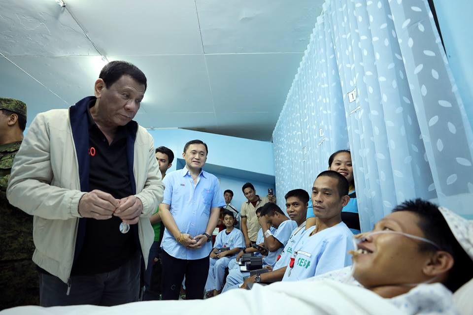 President Rody Duterte visits the wounded soldiers and civilians who are currently confined at the Camp Evangelista Station Hospital in Cagayan De Oro City on September 21, 2018. The Commander-In-Chief conferred the Order of Lapu-Lapu with the rank of Kampilan on the wounded soldiers and assured them of full medical support from the government.