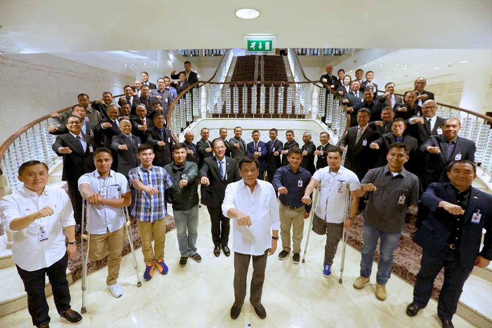 President Rodrigo Roa Duterte strikes his signature pose with Secretary Christopher Lawrence ‘Bong’ Go of the Office of the Special Assistant to the President, Armed Forces of the Philippines Chief of Staff General Carlito Galvez Jr., the President’s security personnel, and some soldiers who lost their limbs while taking part in the liberation of Marawi City from the threats of the Maute terror group at the Intercontinental Hotel in Amman, Jordan on September 7, 2018.