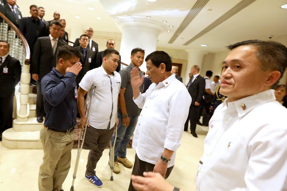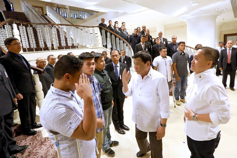 President Rodrigo Roa Duterte talks to the soldiers who lost their limbs while taking part in the liberation of Marawi City from the threats of the Maute terror group at the Intercontinental Hotel in Amman, Jordan on September 7, 2018. Joining the President are Secretary Christopher Lawrence 'Bong' Go of the Office of the Special Assistant to the President and Armed Forces of the Philippines Chief of Staff General Carlito Galvez Jr.
