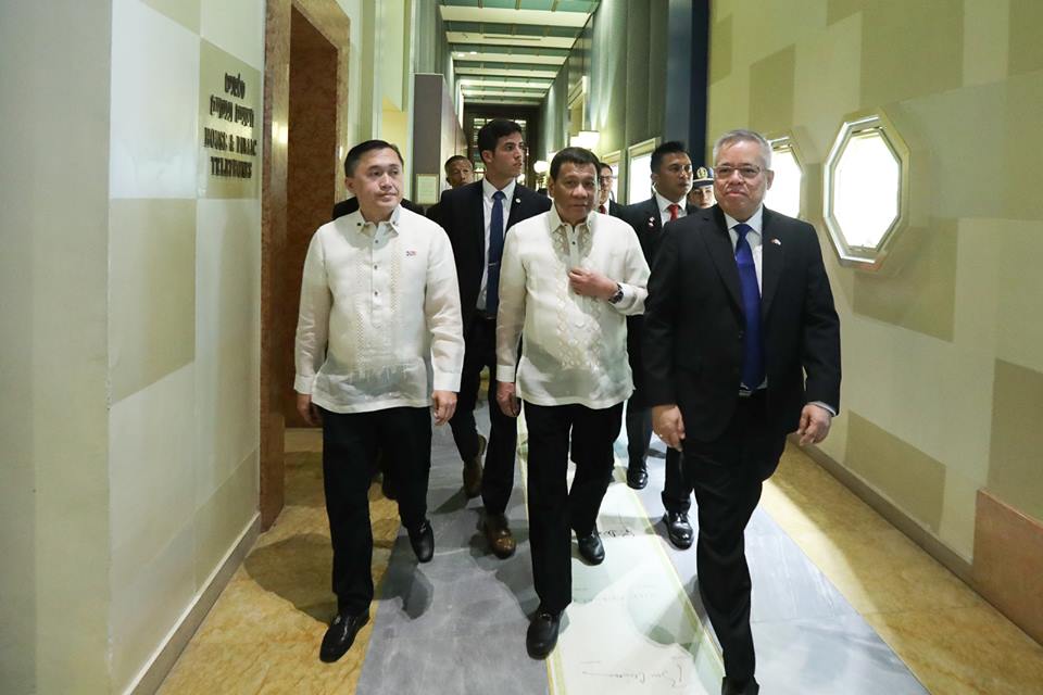 President Rodrigo Roa Duterte is accompanied by Secretary Christopher Lawrence 'Bong' Go of the Office of the Special Assistant to the President and Trade and Industry Secretary Ramon Lopez upon his arrival at the King David Hotel in Jerusalem to witness the ceremonial exchange of business agreements between the Philippines and Israel on September 4, 2018.