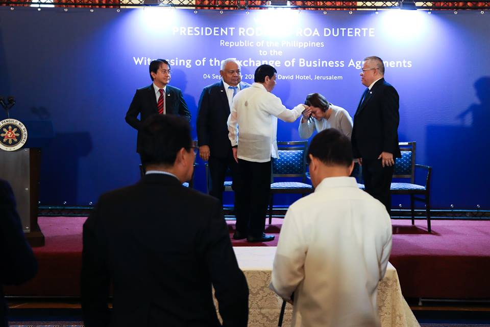 President Rodrigo Roa Duterte extends his hand to daughter Davao City Mayor Sara Duterte-Carpio who showed a gesture of respect to him prior to the ceremonial exchange of business agreements between the Philippines and Israel at the King David Hotel in Jerusalem on September 4, 2018.