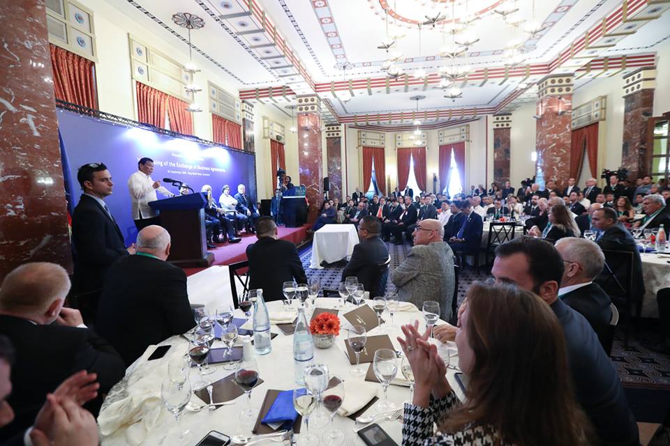 President Rodrigo Roa Duterte, in his speech during the ceremonial exchange of business agreements between the Philippines and Israel at the King David Hotel in Jerusalem on September 4, 2018, assures the Israeli companies that the Philippines will provide them a corruption-free business environment. A total of 21 business agreements were signed between various private companies from the Philippines and Israel. The agreements have an estimated investment value of $82.9 million and are expected to generate around 790 jobs for the Filipinos.