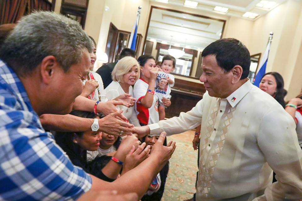 President Rodrigo Roa Duterte shares a light moment with his supporters on the sidelines of the ceremonial exchange of business agreements between the Philippines and Israel at the King David Hotel in Jerusalem on September 4, 2018.