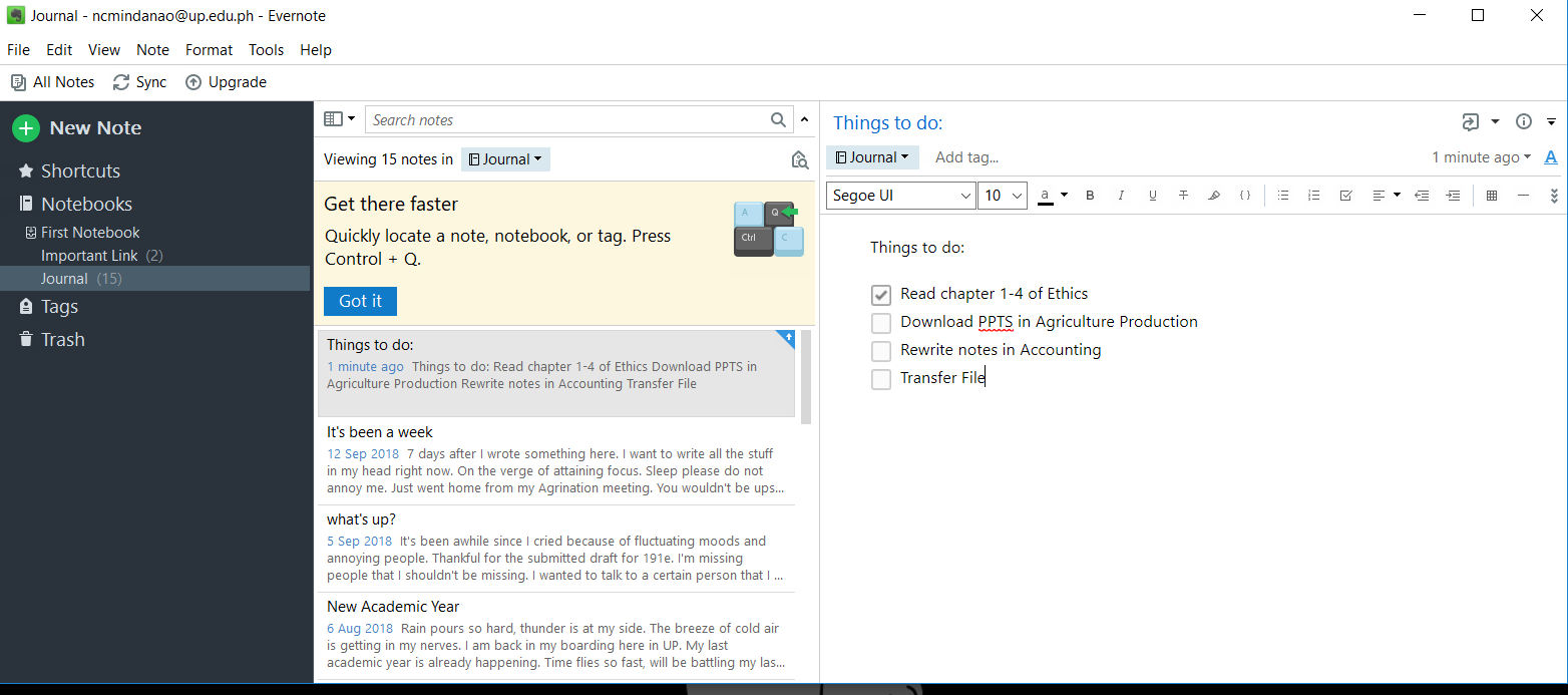 Evernote is a digital journal where you can write your notes and attach photos for convenience. I also use this app for studying because I can access and highlight my PDF files. Also, it has a to-do list which guides in your deadlines and day-to-day errands. The strength of this app is to organize your files and enable quick searches of your notes.