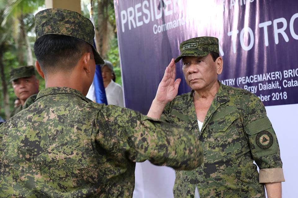President Rodrigo Roa Duterte salutes one of the awardees during his visit to Camp Juan Ponce Sumuroy in Catarman, Northern Samar on October 2, 2018.