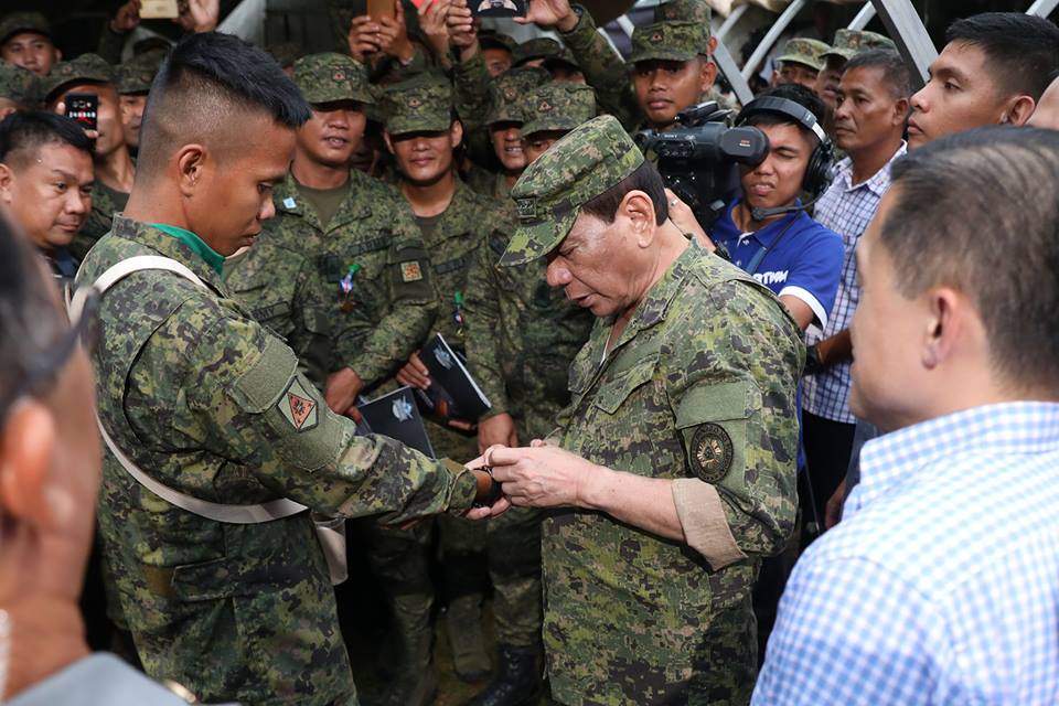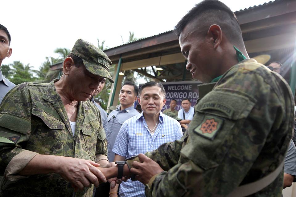 President Rodrigo Roa Duterte gives his watch to one of the personnel of the 803rd Infantry Brigade (803IB) during his visit to Camp Juan Ponce Sumuroy in Catarman, Northern Samar on October 2, 2018.