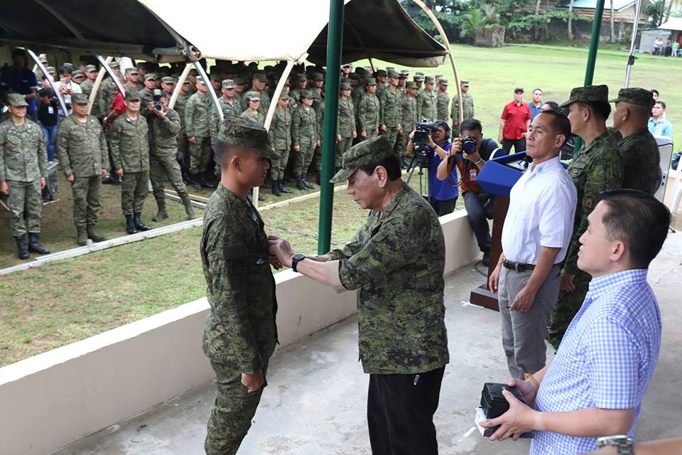 President Rodrigo Roa Duterte awards a medal to one of the personnel of the 803rd Infantry Brigade (803IB) during his visit to Camp Juan Ponce Sumuroy in Catarman, Northern Samar on October 2, 2018.