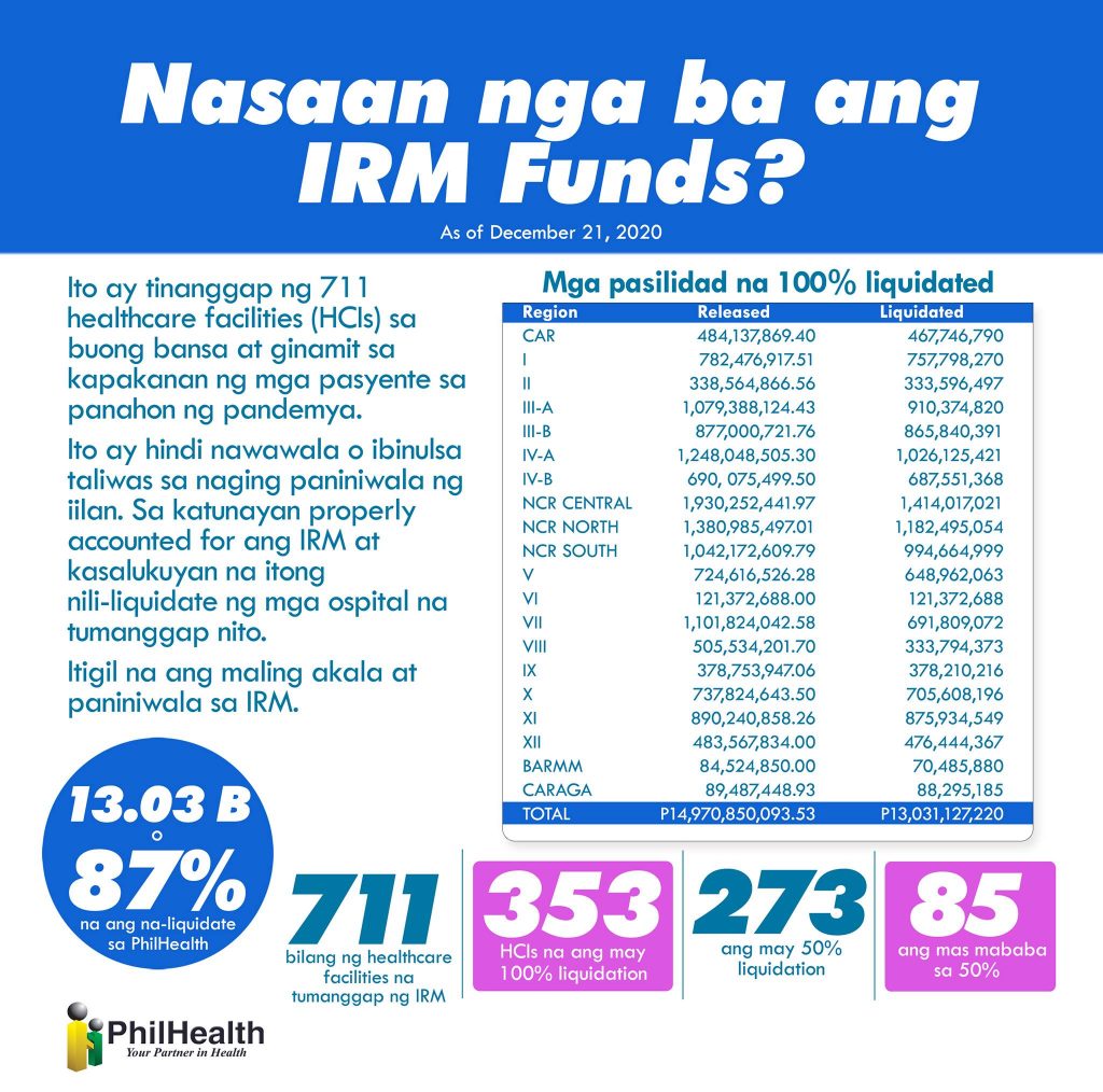 PhilHealth released an update on the Php 15B funds on their Facebook page, and as of December 21, 2020, almost 83% or Php 13.03B has been liquidated by 711 Healthcare Facilities (HCI’s) that received the Interim Reimbursement Mechanism (IRM).