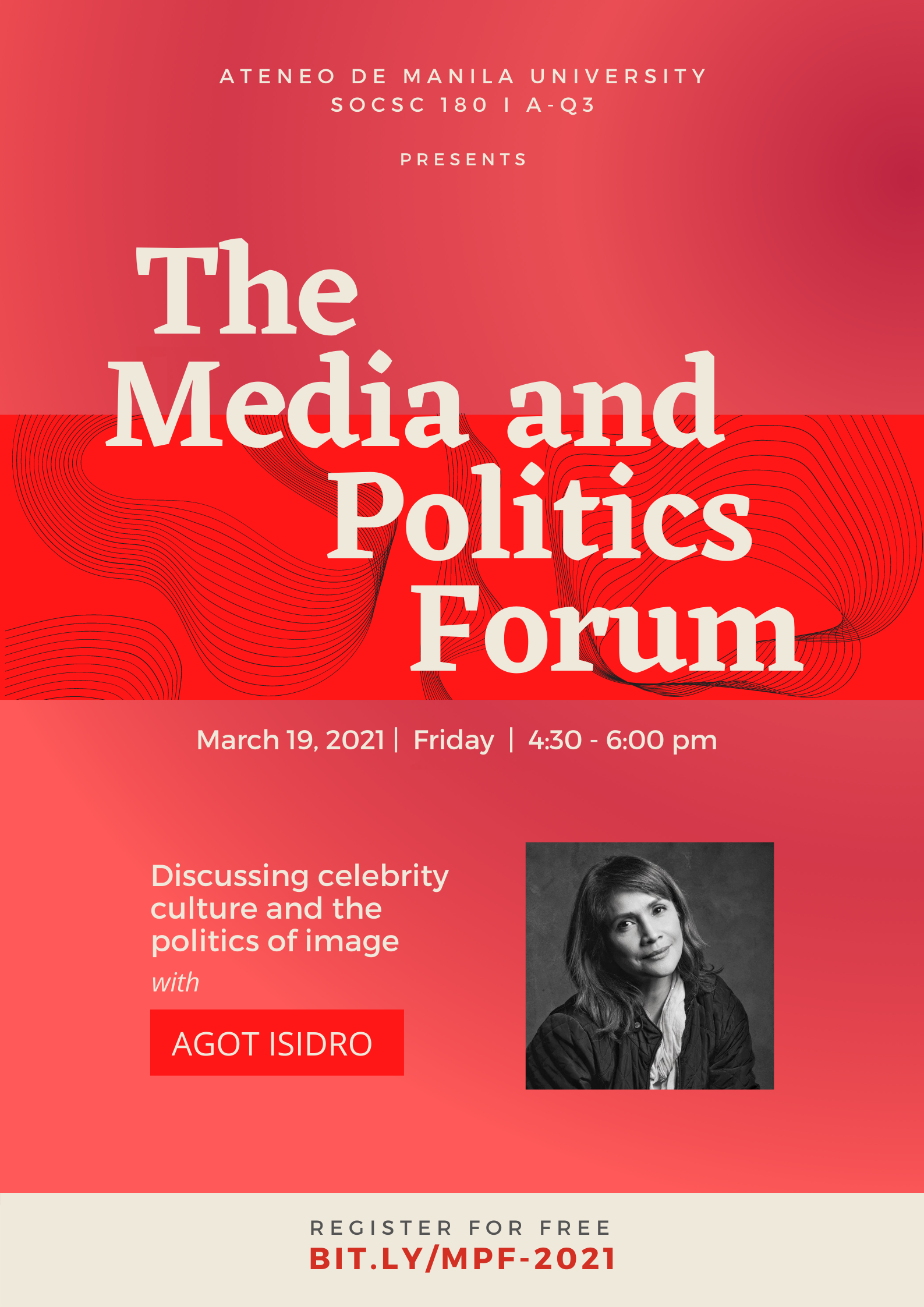 About: Students from Ateneo de Manila University SocSci 180i – Section A-Q3 have arranged a Media and Politics Forum to discuss celebrity culture and the politics of image with Agot Isidro. People may join in the discussion by sending their questions. This event is free to all!